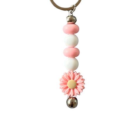Silber Schlüsselanhänger in den Farben Weiß/Rosa mit einem Blumen-Silikon-Anhänger.