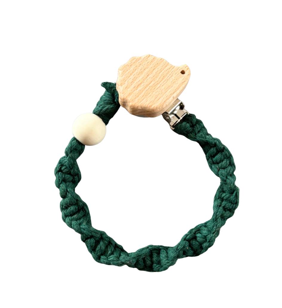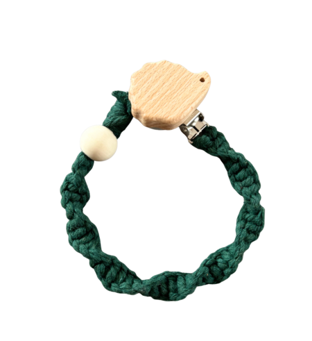 Makramee Schnullerkette in Grün mit Igelclip