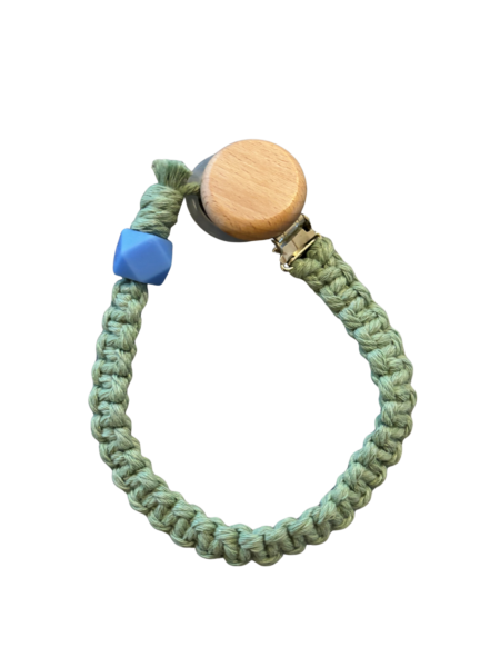 Makramee Schnullerkette in hellgrün mit blauer Silikonperle