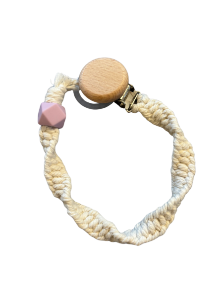 Makramee Schnullerkette in weiß, spiralförmig gefochten mit rosa Silikonperle