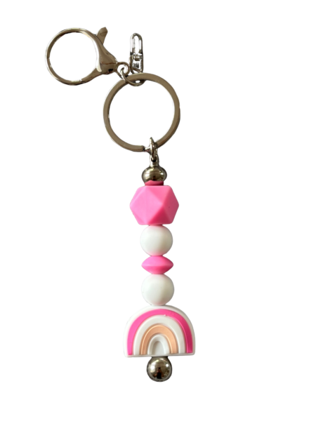 Schlagwörter: Regenbogen, Rosa, Schlüsselanhänger, Silikonperlen, Weiß